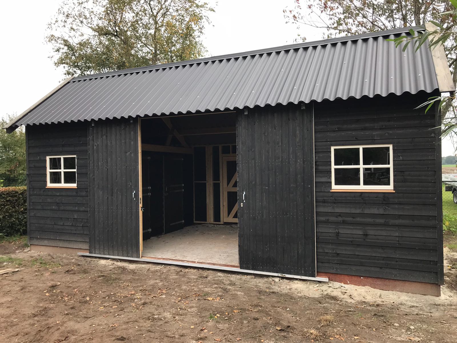 Dierenverblijf, uitvoering in Zweeds rabat met golfplaten. Binnen is een zadelruimte. Grote schuifdeuren zorgen voor een gemakkelijk entree.